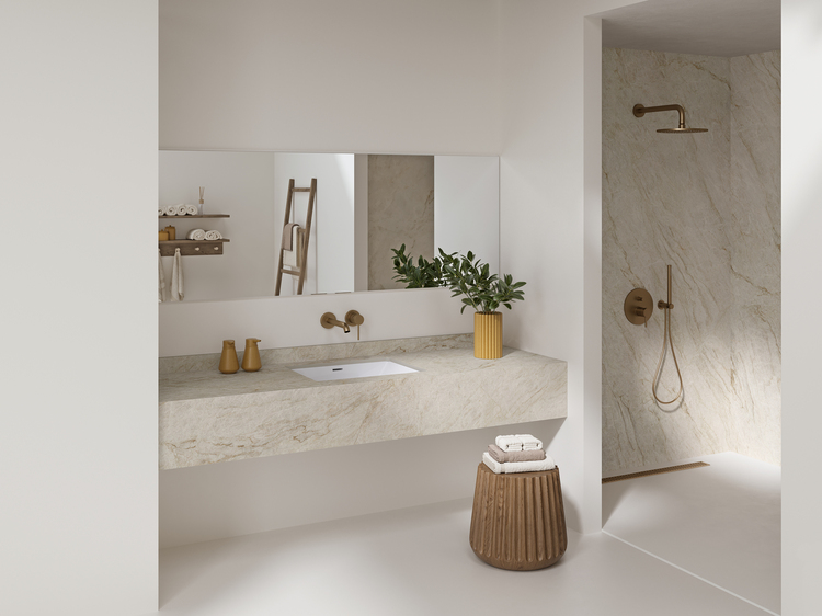 Neolith Taj Mahal replicates the noble and natural appearance of the finest quartzite, with a warm beige tone and delicate ochre veins that convey calm and balance. Its luminous aesthetic is perfect for creating serene and elegant spaces that radiate warmth and modernity. This model brings a unique character to the space, transforming it into an evocative environment. Its soft color and mineral undertones create a sense of openness and clarity, adapting effortlessly to both classic and contemporary styles, while elevating the design with a refined and sophisticated touch.
