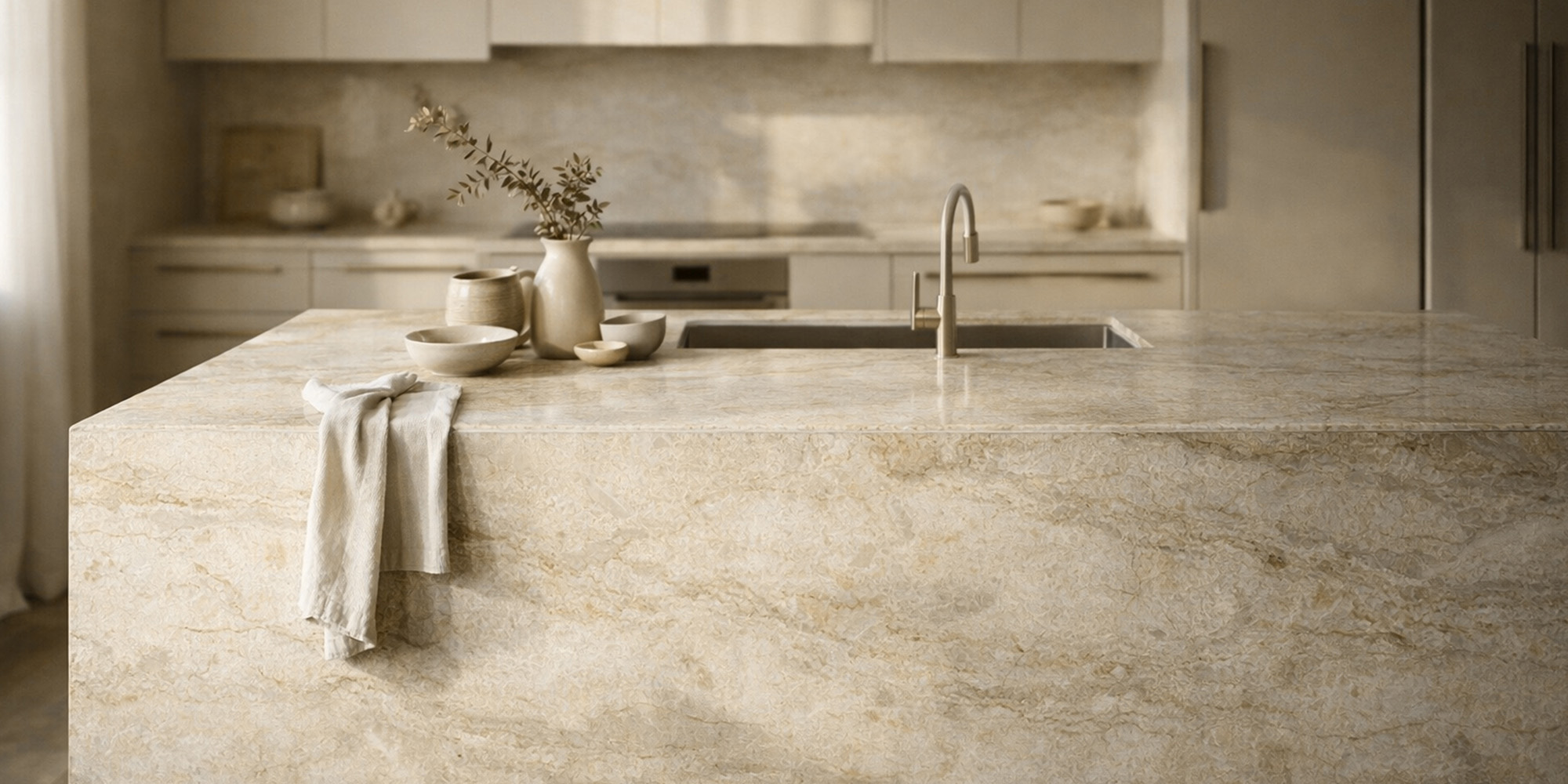Taj Velato, captures the renowned elegance of natural Taj Mahal quartzite through a uniquely softened lens, presenting a surface veiled in sophisticated subtlety. The Italian word for “veiled” perfectly describes this design, where a warm, light beige base is delicately draped with whispers of light white veining.