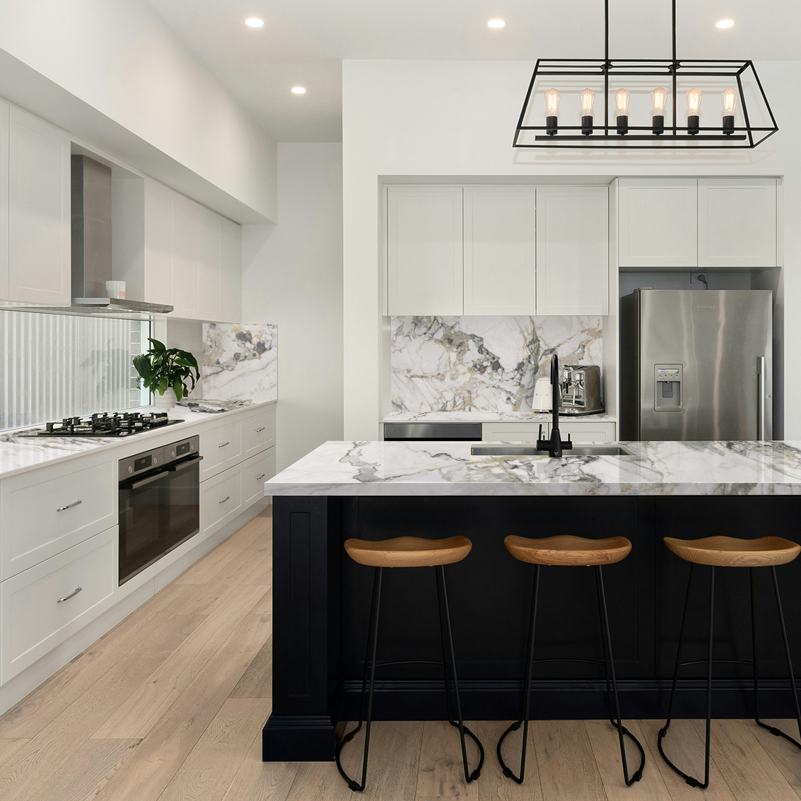 With sweeping veins and a luxe white backdrop, Calacatta Capriccio by U-Quartz brings high-end energy to any space. Its 2cm thickness makes it ideal for full-height backsplashes, delivering a seamless, slab-to-ceiling statement that elevates kitchens to true design showpieces.