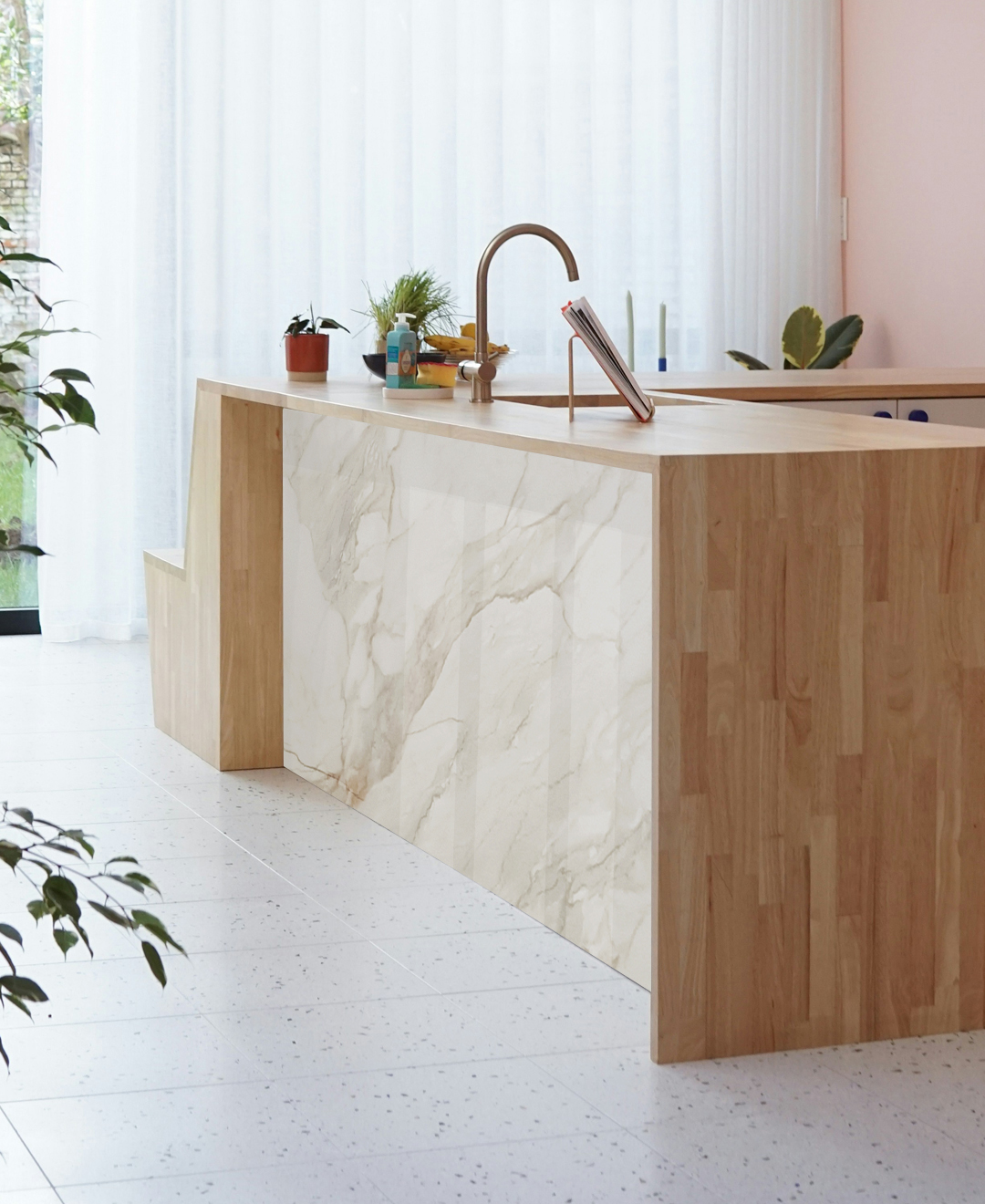 Crescendo White is a premium, 2cm U-Quartz Printed Surface available from UGM Surfaces, featuring a warm white base with delicate golden streaks. Known for its luxurious, marble-like appearance, it is nonporous, durable, and available in book-matched designs.