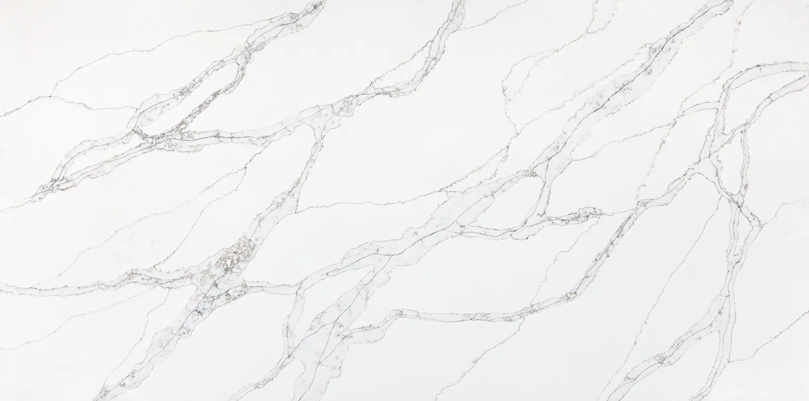Calacatta marble-inspired quartz, featuring a white background with dynamic light grey veining.