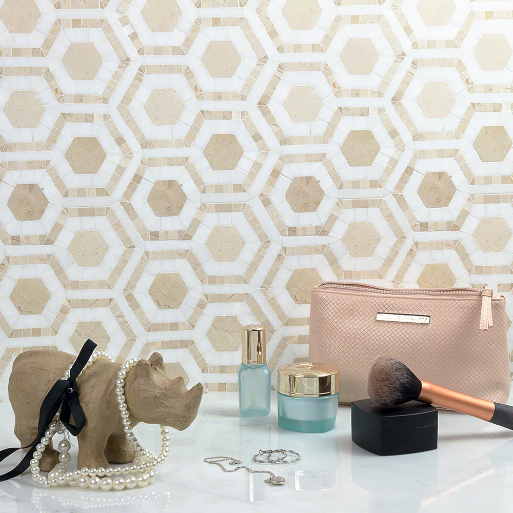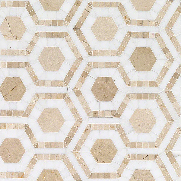 Evo Hex Crema & Thassos 4″ Hexagon Marble Polished Mosaic Tile