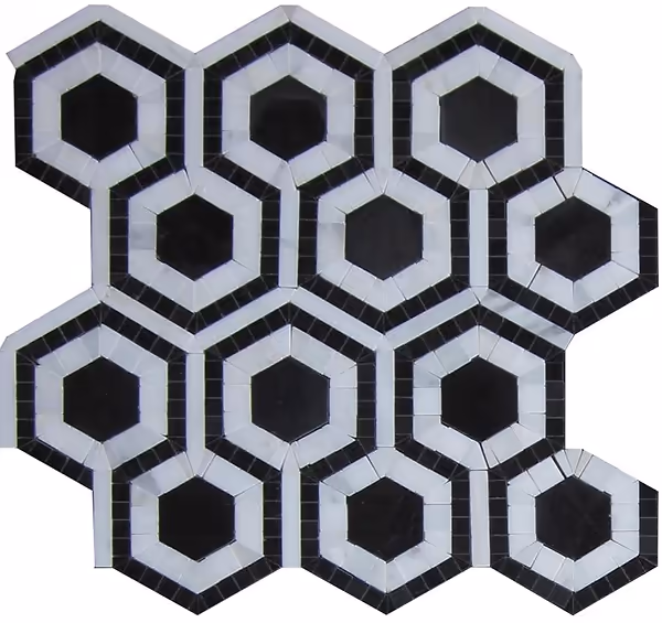 Evo Hex Nero & Asian Statuary 4″ Hexagon Marble Polished Mosaic Tile